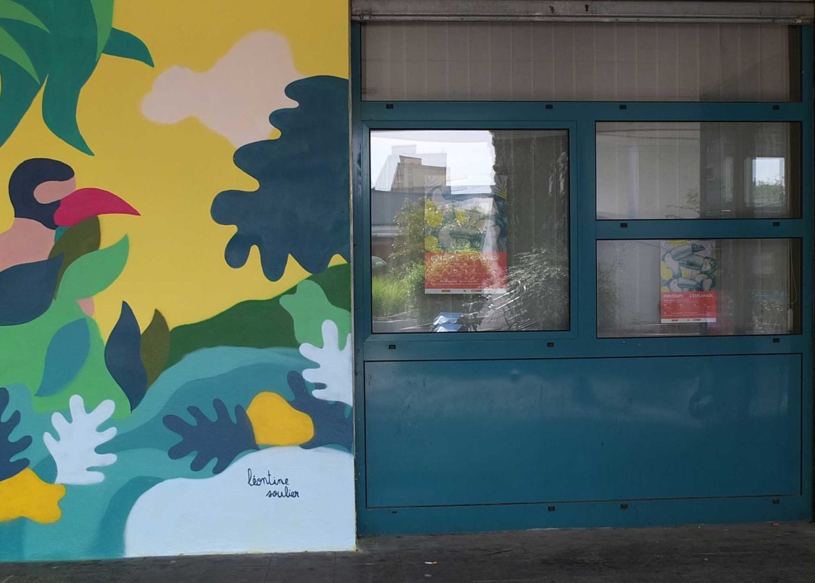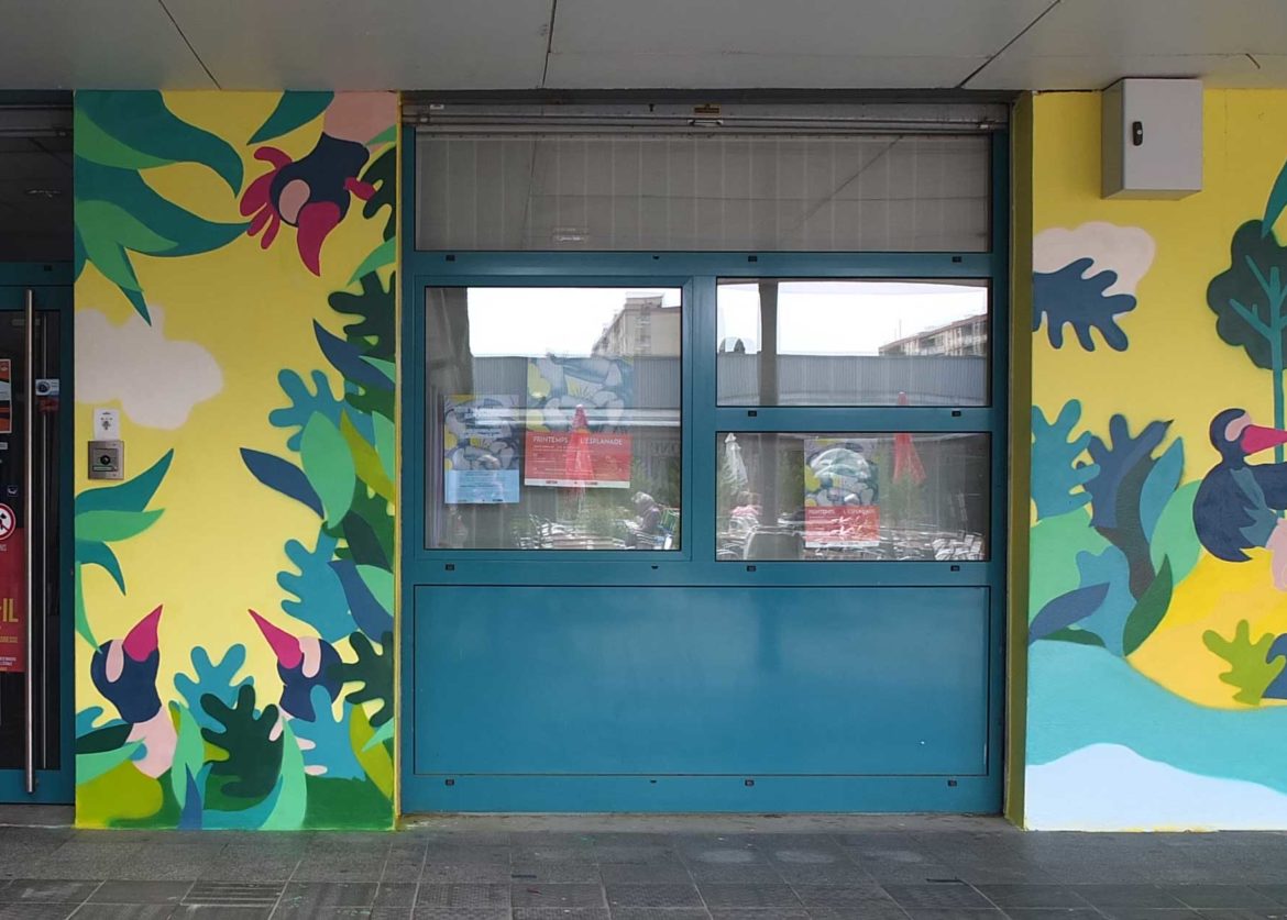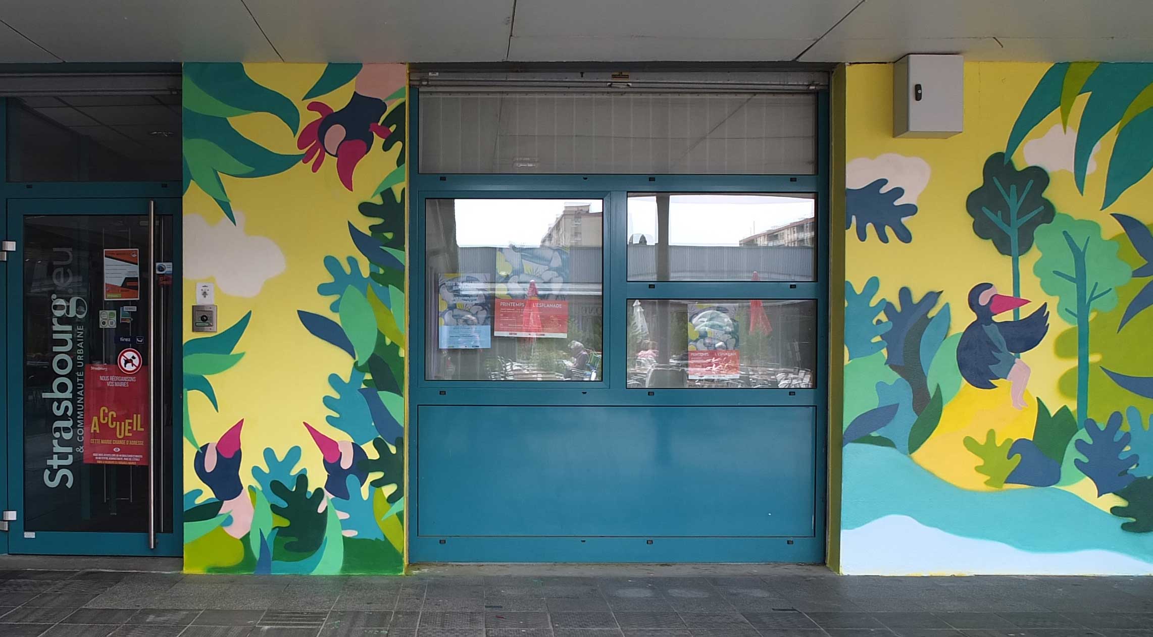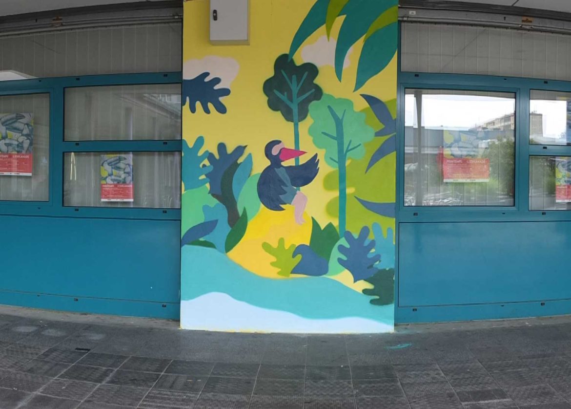 La fresque se situe dans le centre commercial, lieu de passage, d'échanges. On y passe pour faire ses courses, on s'y arrête pour manger. On y croise les étudiants du campus d'à côté, les enfants qui rentrent de l'école, les retraités qui sortent du bridge. C'est un lieu vivant, mais si gris. J'ai essayé d'y apporter de la couleur et de la poésie. Ces hommes oiseaux sont là, pour veiller sur les habitants, leur apporter du soleil.
